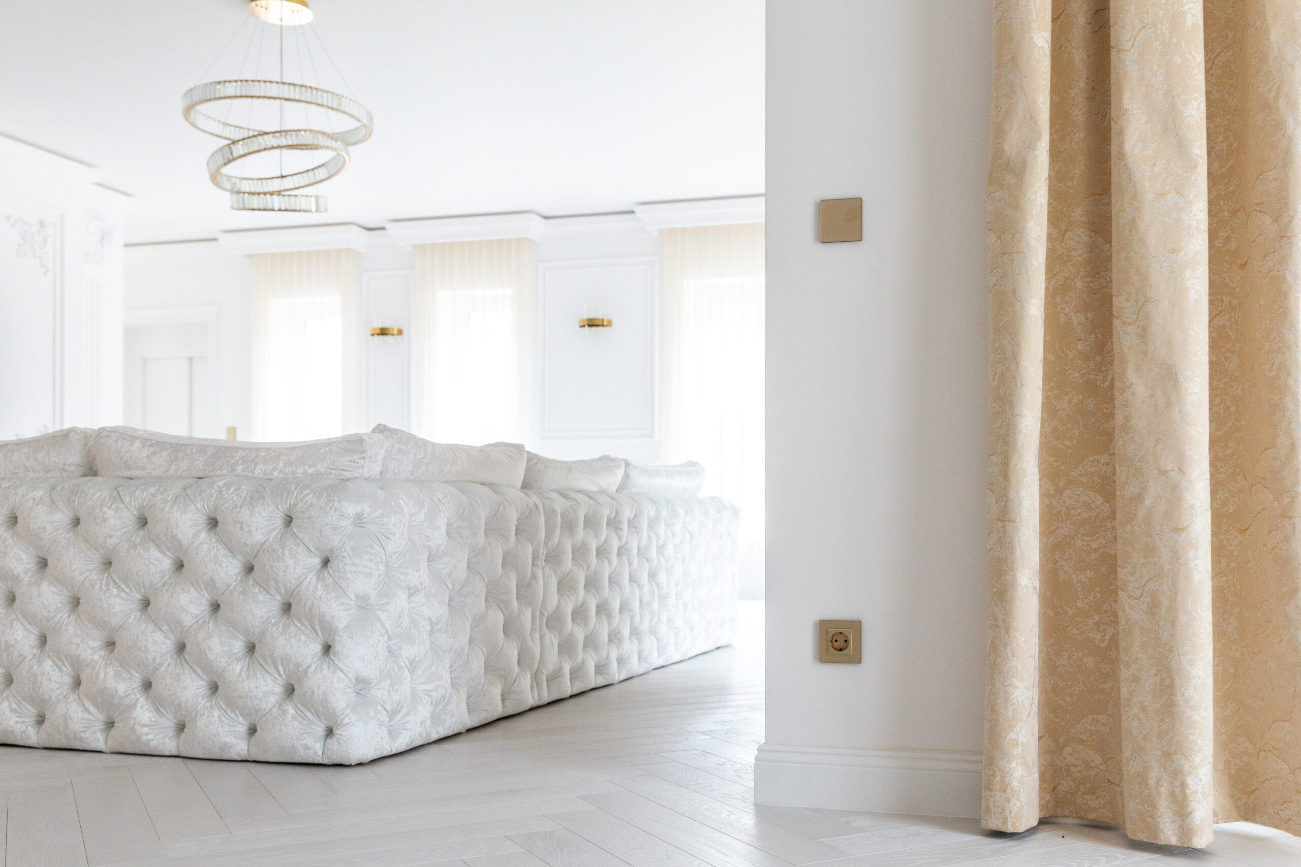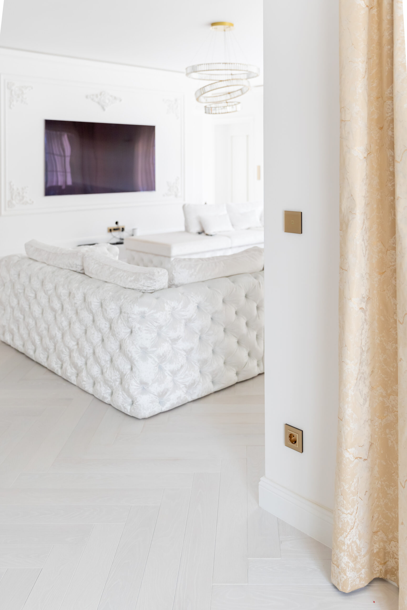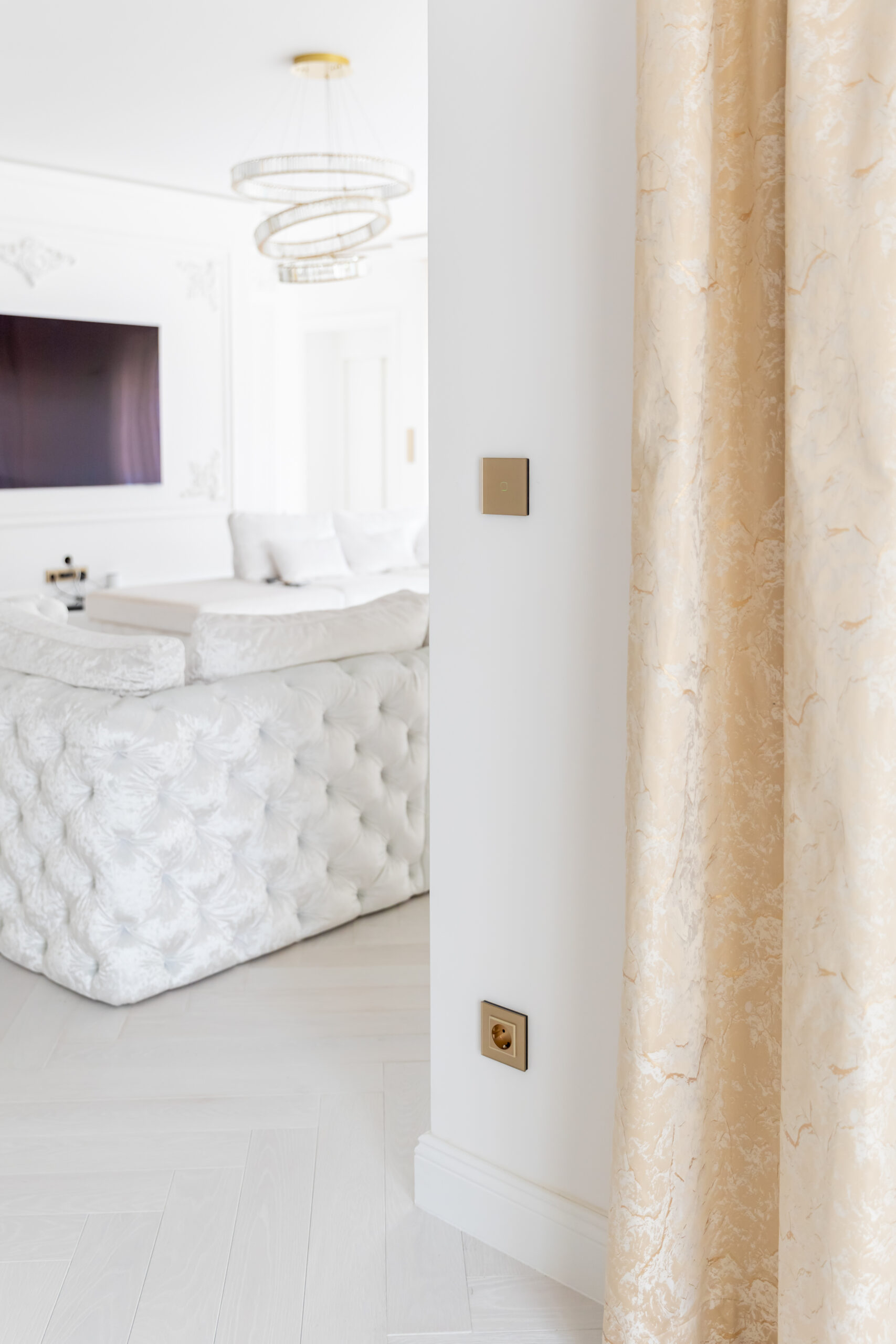 A belső tér kialakításánál minden részlet harmóniában van. A Smarthugo üveg érintőkapcsolók nem csupán esztétikai értékeket képviselnek, hanem a modern dizájn alapvető elemei is. A bézs, fehér és arany árnyalatok közötti összhang diszkréten, de határozottan emeli ki a tér eleganciáját.
